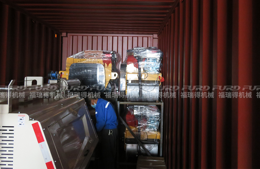 9月3日,福瑞得機械6臺手扶雙輪壓路機、和2臺9米移動燈車裝車出口非洲。