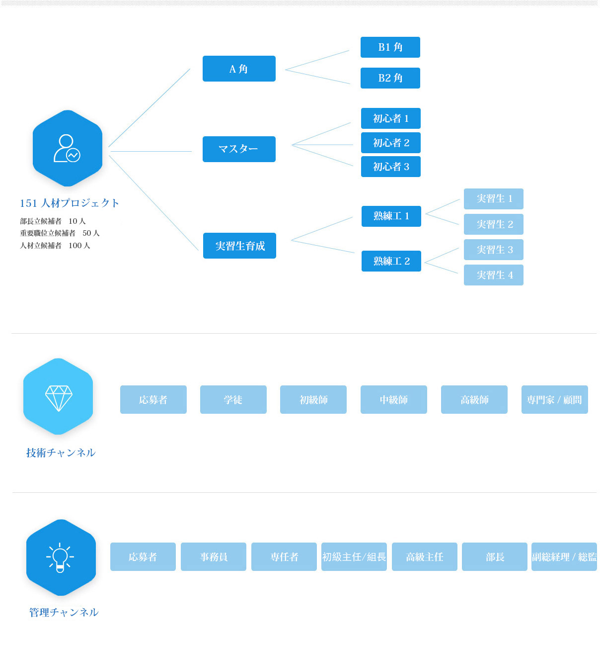 2018年は會(huì)社が上場(chǎng)する前に急速に発展する一年で、人材へのニーズが拡大する一方です。企業(yè)発展の狀況を考え、會(huì)社が人材バンクメカニズムを考案し、重要職位に能力のある人材が任用できるように人材立候補(bǔ)者を育成します。會(huì)社は「AB角」、「熟練工が初心者を教える」、実習(xí)生育成などのやり方で方正會(huì)社の「151人材プロジェクト」を確実に実行しています。